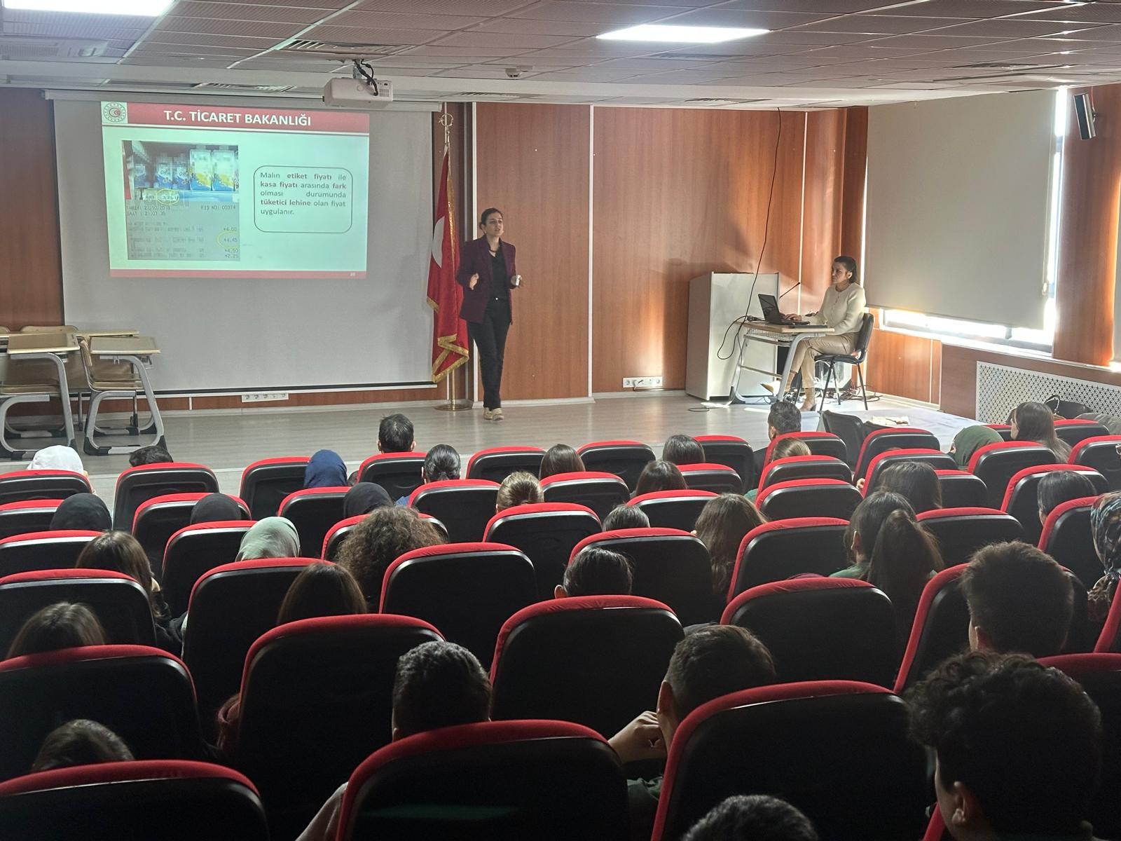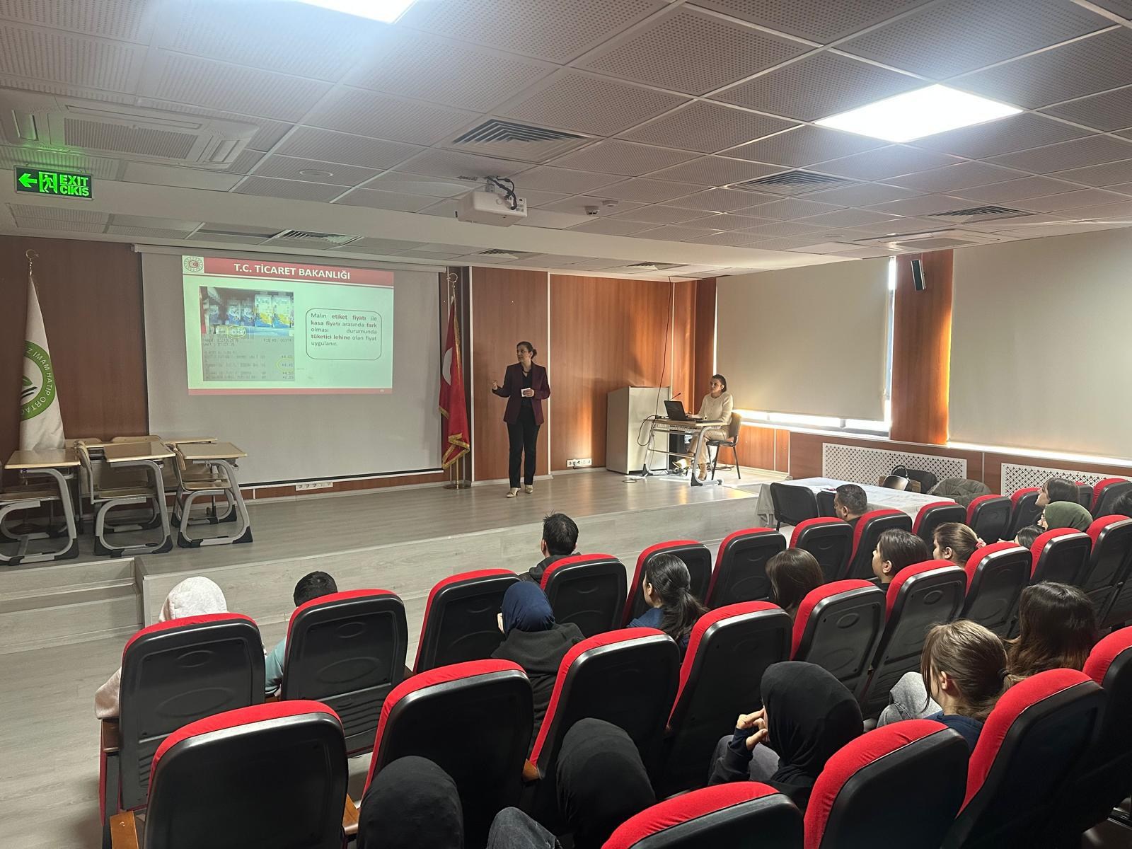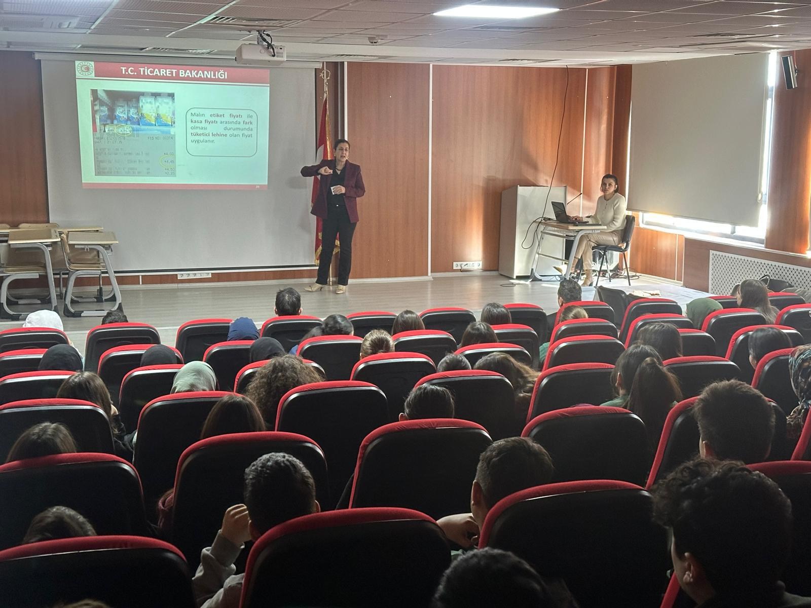 İl Müdürlüğümüz personeli V.H.K.İ. Gökben ULUS ve V.H.K.İ. Halime KÖR tarafından yapılan sunumda, öğrencilerimize tüketici hakları, tüketici hakem heyetleri ve nasıl bilinçli tüketici olunacağı konularında bilgiler verildi.
